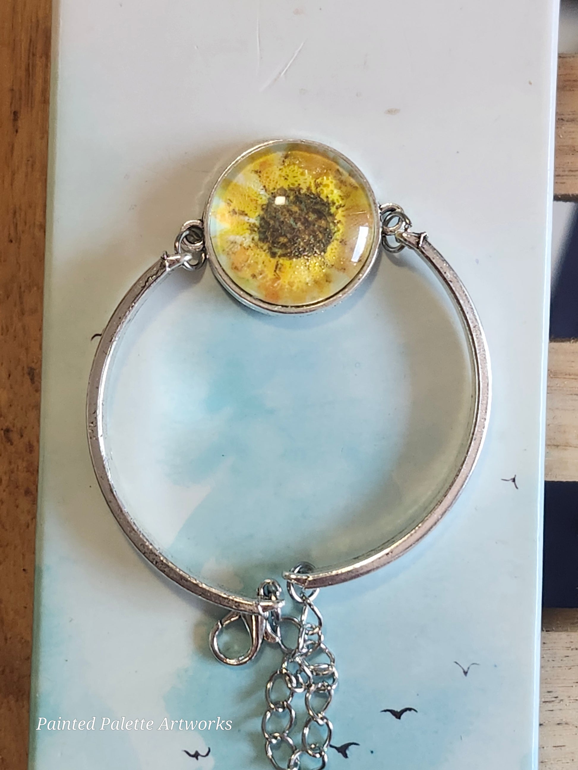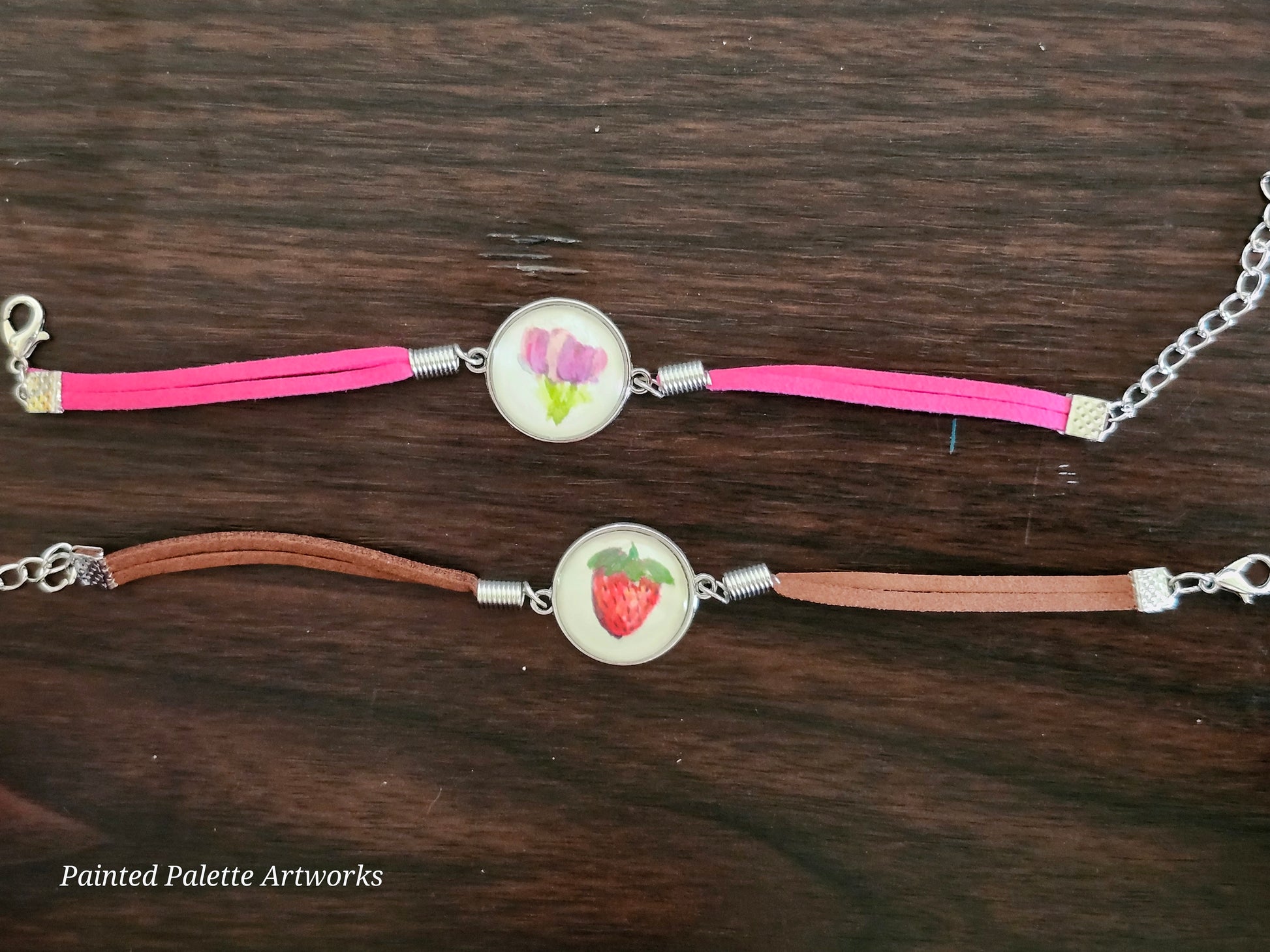 Various styles of bracelets with an original watercolour painting under a glass cabochon.